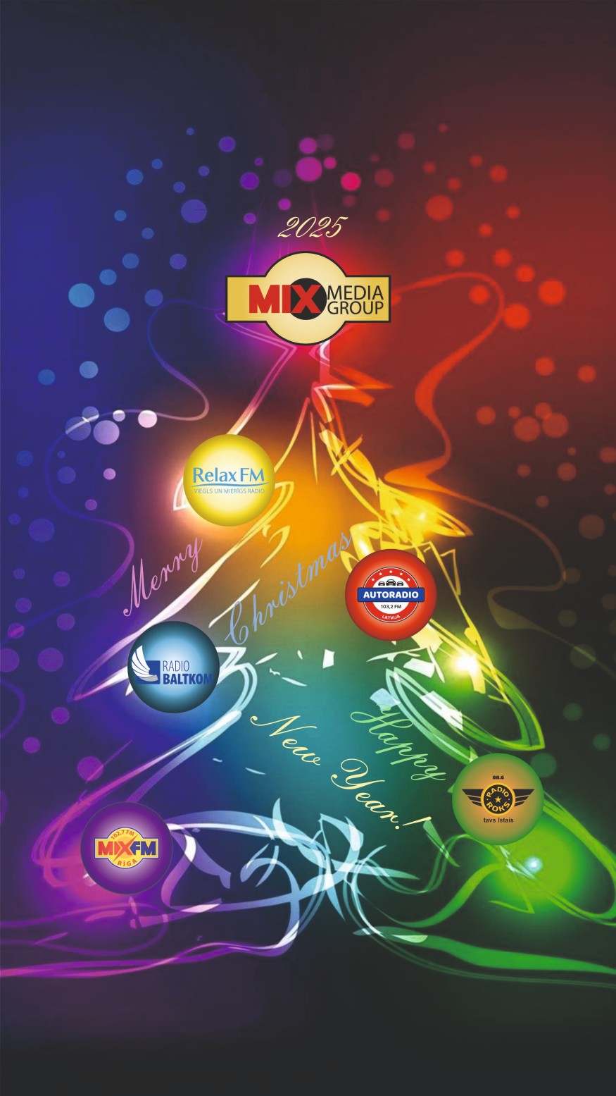 MIX MEDIA GROUP, объединяющая пять ведущих радиостанций Латвии, от всей души поздравляет дорогих слушателей с Рождеством и Новым годом! Пусть наступающий год подарит вам радость, светлые события и незабываемые моменты. Мы обещаем продолжать радовать вас любимой музыкой и увлекательными программами. Пусть наши мелодии наполняют вашу жизнь вдохновением и счастьем!