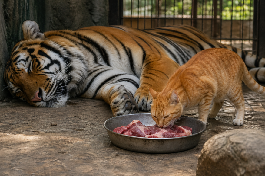 Любопытно, что тигр никак не реагирует на дерзкого «гостя». Впервые заметив кота, он не проявил агрессии, а скорее удивился. Со временем хищник, похоже, просто смирился — теперь он спит, пока кот спокойно доедает его обед.