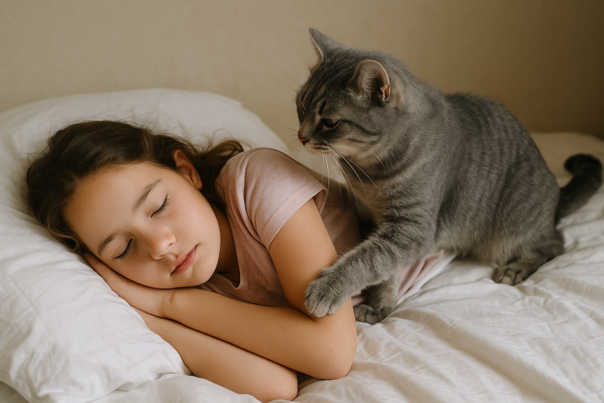 В Бостоне (США) мама придумала необычное решение, как прекратить утренние ссоры с дочерью по поводу подъёма в школу. Теперь ребёнка будит полосатая кошка по кличке Сьюки, которая не отступает, пока девочка не встанет с кровати.