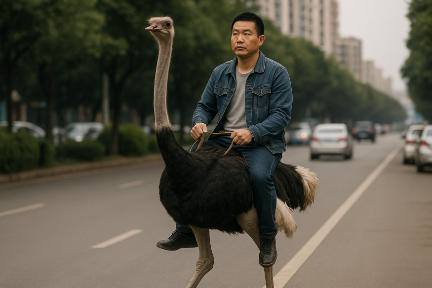 На протяжении последних десяти лет 32-летний А Хуа из города Куньмин (провинция Юньнань, Китай) привлекает к себе внимание необычным образом передвижения — он ездит верхом на страусах.