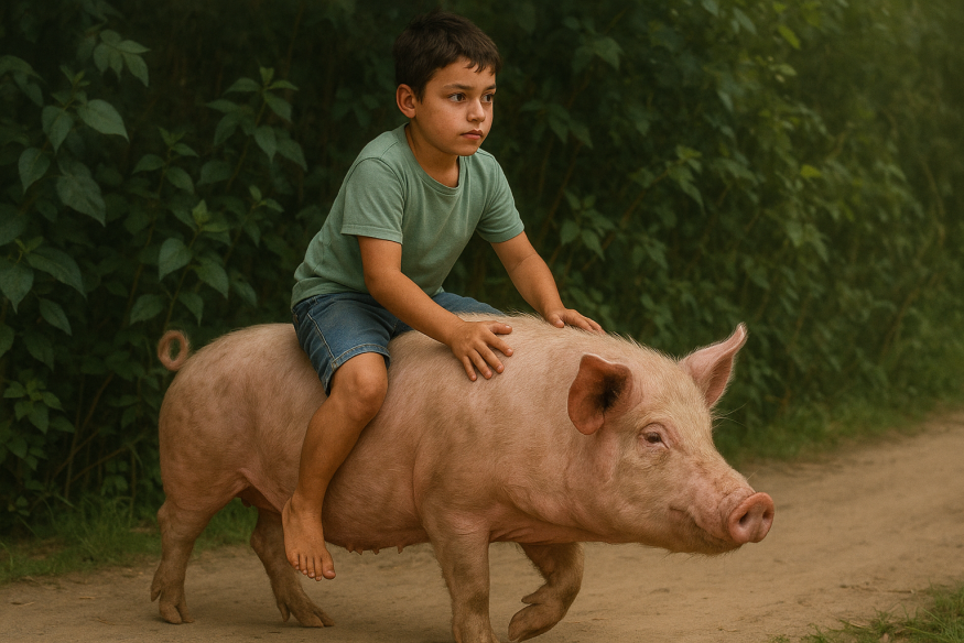 Девятилетний школьник из Бразилии ездит в школу верхом на свинье