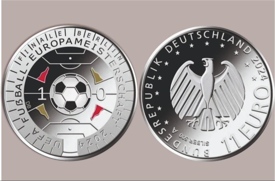 В Германии в этом году выпустят памятную монету из серебра 500-й пробы нарицательной стоимостью 11 евро, посвященную ЧЕ по футболу 2024 года. Монета появится в обращении 8 мая 2024 года. Выбор необычного номинала обусловлен тем, что в футбольной команде участвуют 11 игроков. Это символичное решение придает монете дополнительную спортивную значимость и связывает ее напрямую с тематикой Чемпионата Европы.
