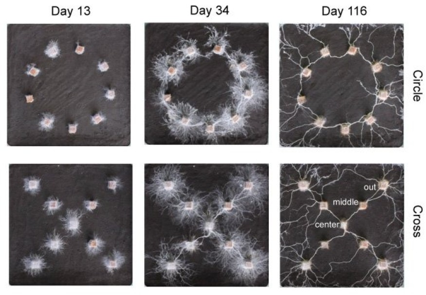 Японские исследователи из Университета Тохоку поделились удивительным открытием: гриб Phanerochaete velutina распознает формы и передает данные о своем окружении через мицелиальную сеть. В рамках экспериментов ученые разместили бруски из дерева различных форм и позволили мицелию расти на них.