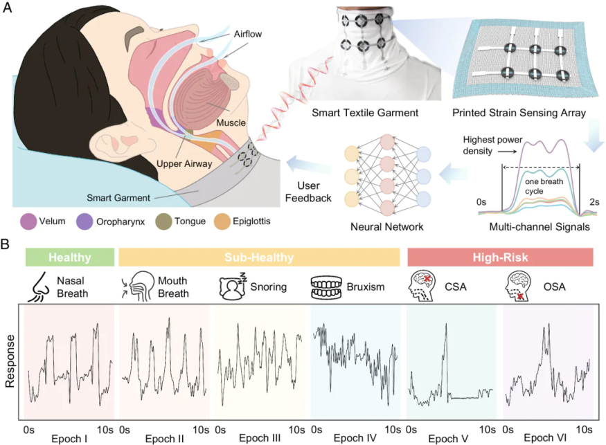 Исследователи из Кембриджского университета представили инновационные пижамы, оснащенные встроенными датчиками, которые с высокой точностью (98,6%) отслеживают шесть типов состояний сна: носовое и ротовое дыхание, храп, скрежет зубами, а также центральное (CSA) и обструктивное (OSA) апноэ.